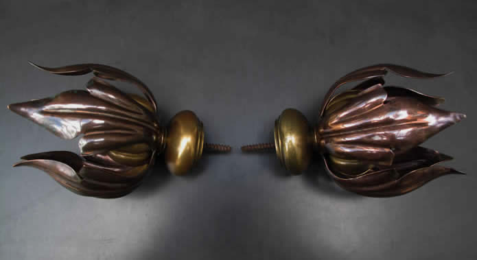 Antique WAS Benson brass and copper curtain pole finials.