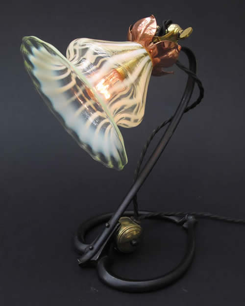 Antique WAS Benson iron, brass and copper lamp complete with stunning Powell vaseline shade.