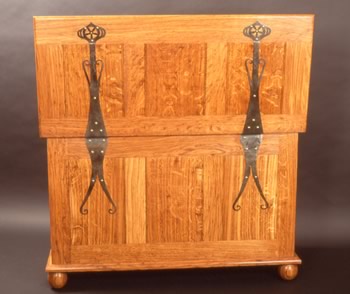 Hand forged iron hinges and three copper repoussé panels inside the lid, representing